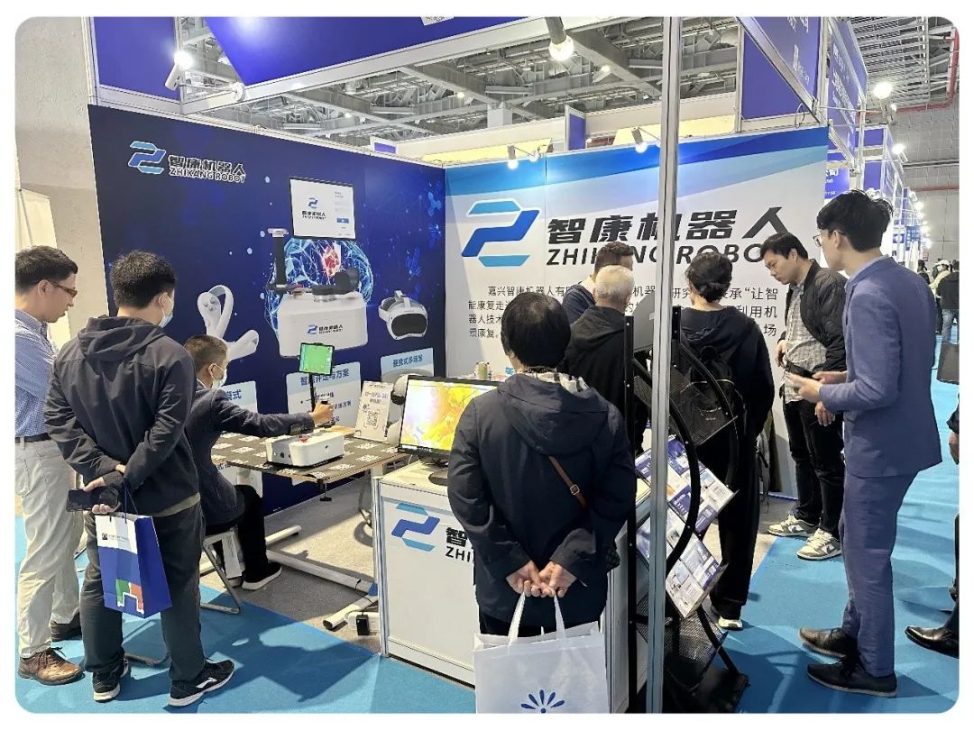 展台展示了智康自主研发的上肢康复机器人,充满趣味性的康复训练模式吸引了众多观众前来体验,也深受业内人士的好评。